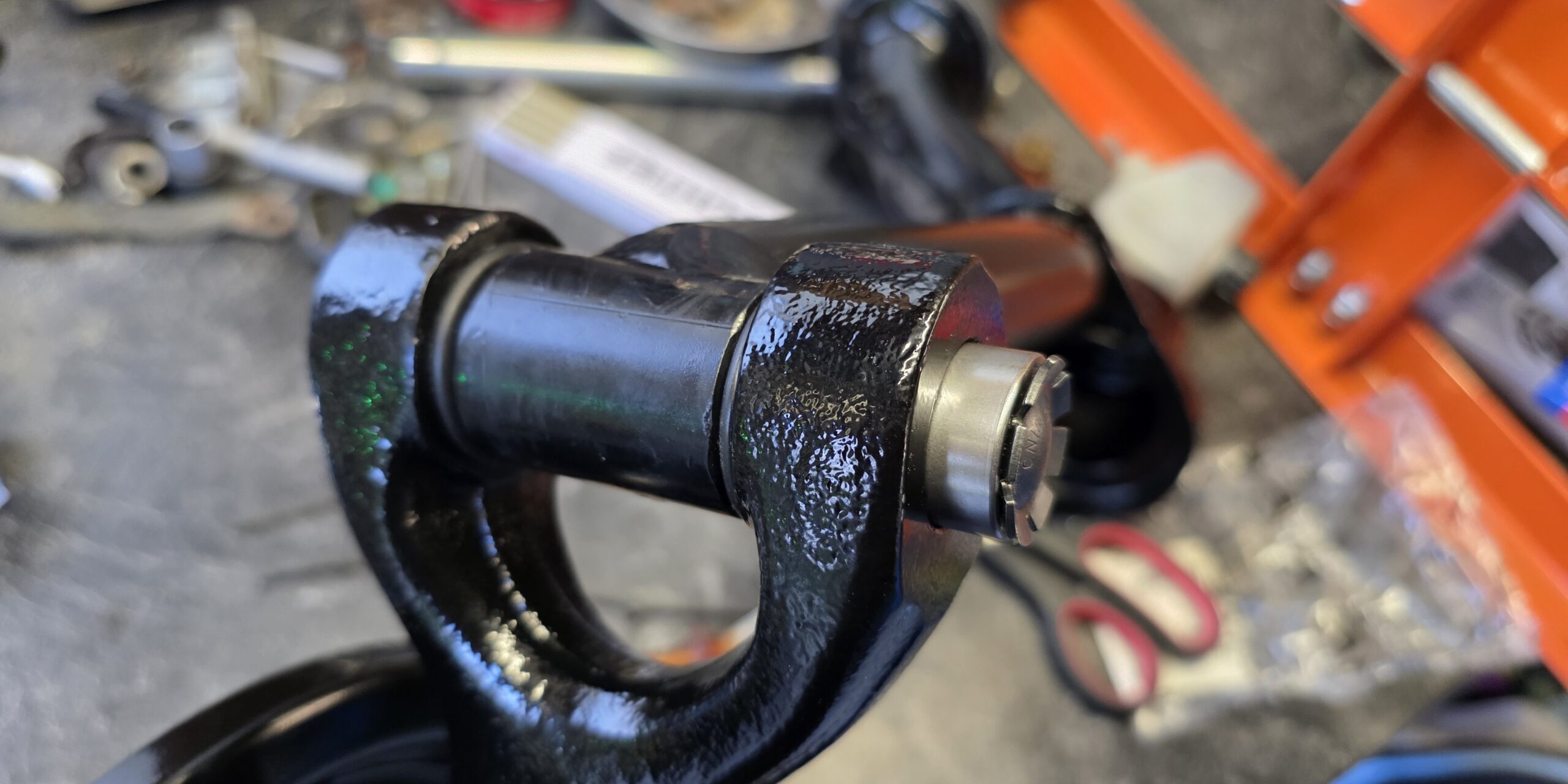 Nun erwärmt man den inneren Teil der Lagerung, also das Ende der Lenkstange, und treibt die Welle mit Hilfe der hydraulischen Presse mitsamt des unteren Lagers komplett heraus. Je nach Verrottungszustand kann dies eine Menge Arbeit sein.