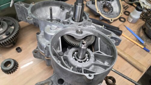 Die Getriebehauptwelle, also jene die den Schaltvorgang übernimmt, wird lediglich in das Nadellager der anderen Motorhälfte gesteckt. Ein ausführlicher Beitrag über die Hauptwelle und wie man diese vernünftig revidiert, ist hier zu finden.